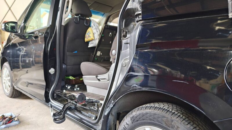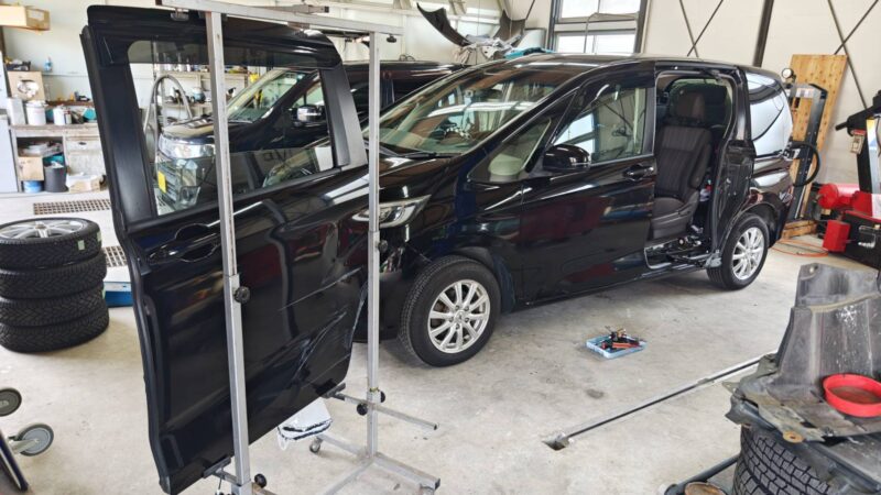 今回のフリードは、左スライドドアを新品へ交換し、クォーターパネルは丁寧に鈑金修理を進めていきます。ご家族での旅行が笑顔で迎えられるよう、細心の注意を払いながらもスピード感を持って進めています。
