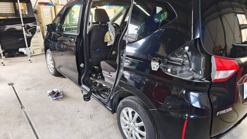 自損事故によるフリードのスライドドア交換とクォーターパネルの鈑金修理。車両保険とレンタカー特約を活用し、GWの家族旅行に間に合わせるべく自社塗装ブースにて特急作業中です。